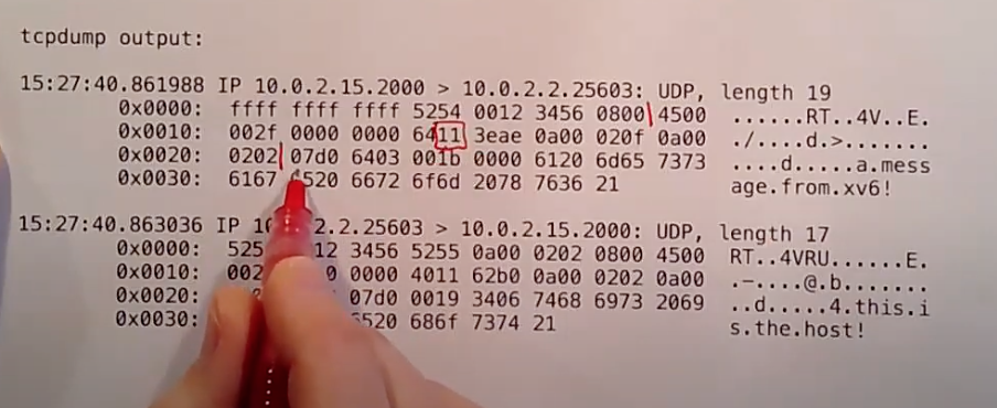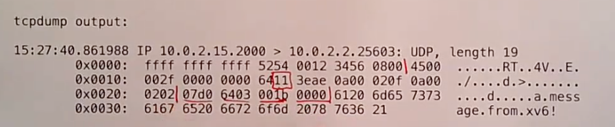接下来的8个字节是UDP header。这里的packet是由lab代码生成的packet,所以它并没有包含常见的端口,源端口是0x0700,目的端口是0x6403。第4-5个字节是长度,第6-7个字节是校验和。XV6的UDP软件并没有生成UDP的校验和。
