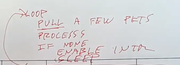 Robert教授:这是个好问题,如果存在多个网卡,我并不知道这里的循环会怎么工作。一个非常合理的设计是,packet处理线程需要记录每个网卡是在中断模式还是在轮询模式,然后只对轮询模式的网卡。。。等一下,因为中断处理程序现在不从网卡读取packet,所以线程中的循环可以直接检查所有网卡,如果网卡中有待处理的packet,就读取几个packet并处理。如果所有的网卡都没有待处理的packet,主循环会打开所有网卡的中断,并进入sleep状态。之后,任何一个网卡的中断都会唤醒packet处理线程。