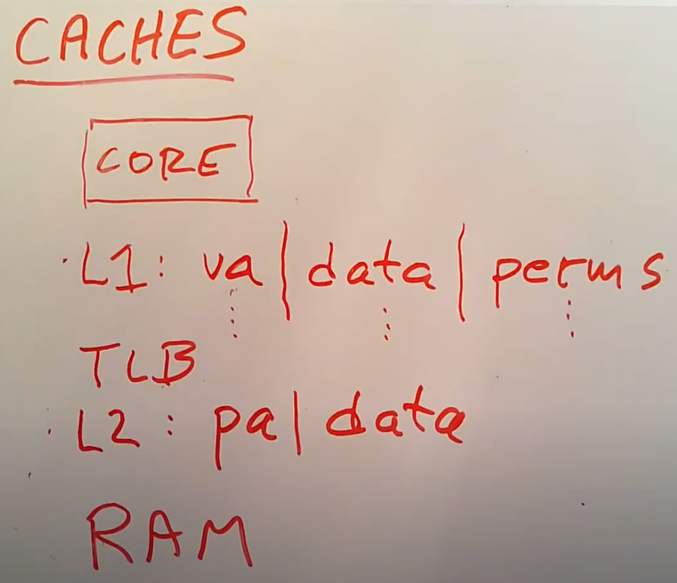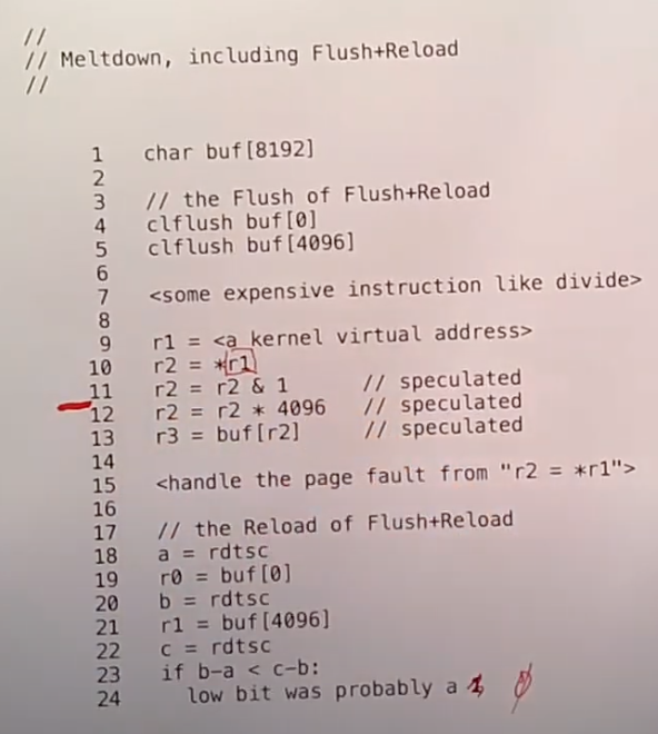 这是Cache的结构,当指令从L1 cache中加载某个数据时,比如说我们想要窃取的内核数据,人们认为数据的权限标志位就在L1 cache中,所以CPU完全可以在获取数据的时候检查权限标志位。实际中,AMD CPU和最近的Intel CPU会在很早的时候检查权限标志位。如果检查不能通过,CPU不会返回数据到CPU核中。所以没有一个预测执行指令可以看到不该看到的数据。