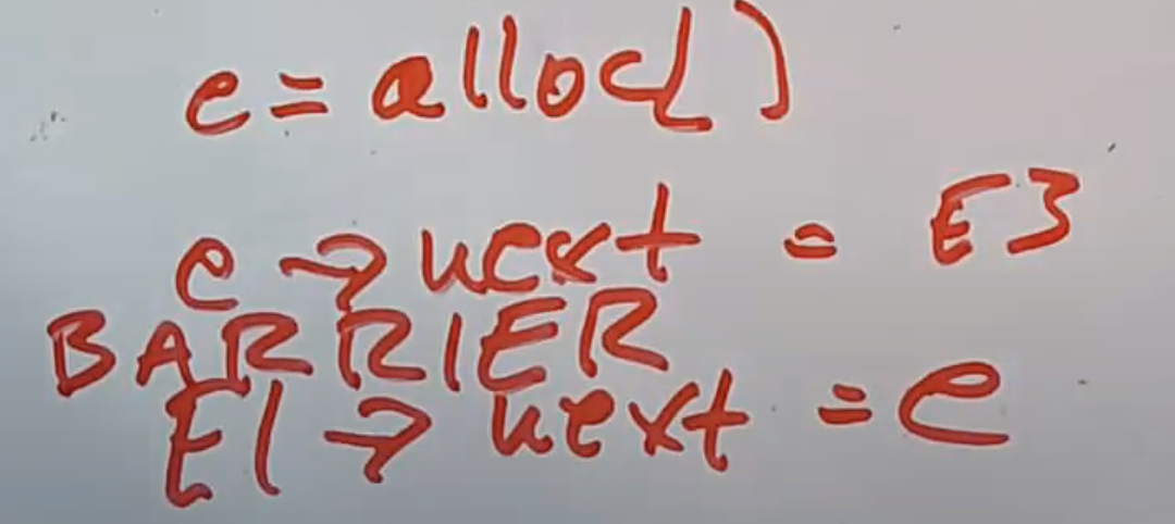 这样可以告知编译器和硬件,先完成所有在barrier之前的写操作,再完成barrier之后的写操作。所以在E1设置next指针指向E2‘的时候,E2’必然已经完全初始化完了。