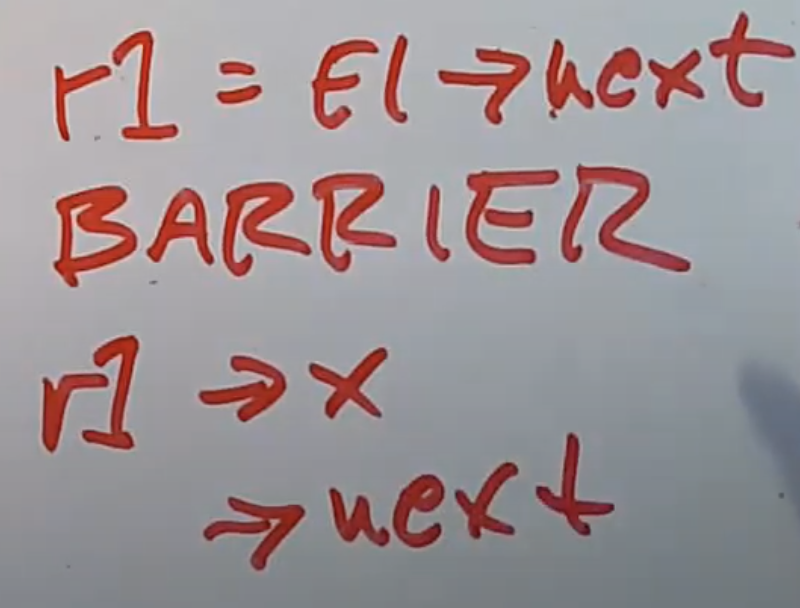 对于数据读取者,需要先将E1的next指针加载到某个临时寄存器中,我们假设r1保存了E1的next指针,之后数据读取者也需要一个memory barrier,然后数据读取者才能查看r1中保存的指针。