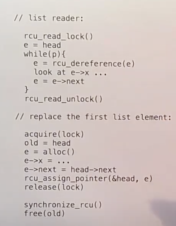 Robert教授:可以返回一个拷贝,如果e->x是个字符串,那么我们可以返回一个该字符串的拷贝,这是没有问题的。但是如果我们直接返回一个指针指向e->x,那就违反了RCU规则。实际上返回e中的任何指针都是错误的,因为我们不能在持有指向RCU保护数据的指针时,发生context switch。通常的习惯是直接在RCU critical区域内使用这些数据。
